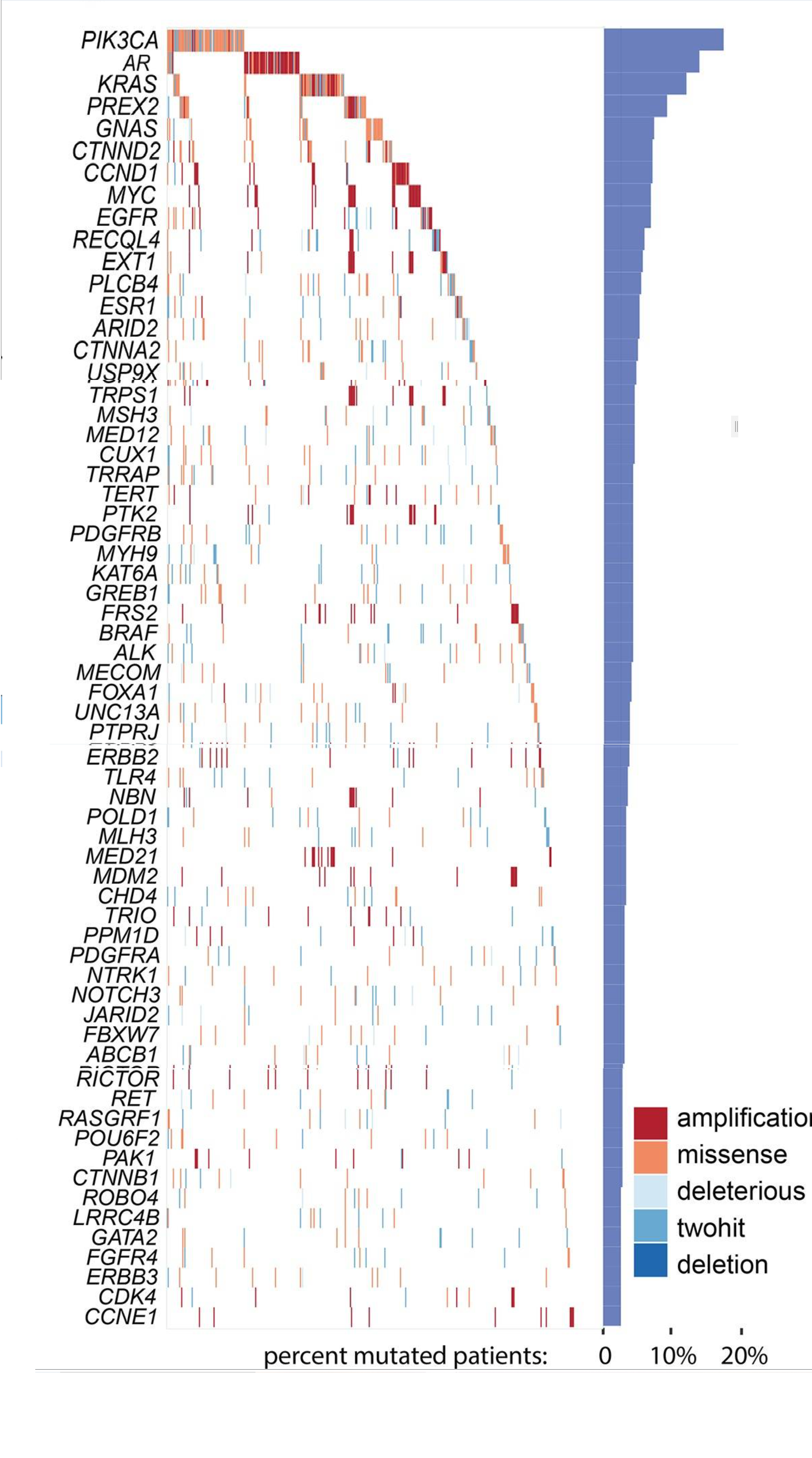 对于每位患者,巅峰国际基因检测在肿瘤和体细胞DNA上进行了配对的外显子组测序,以鉴定可能的致病性变异并确定其为体细胞或生殖系来源。肿瘤和正常外显子组的平均目标覆盖深度分别为180X和120X。平均肿瘤含量为62%。在目标区域内,转移性肿瘤的基因解码平均在每位患者身上发现119个体细胞突变。对于大多数癌症类型,与TCGA中的原发肿瘤相比,转移灶中的突变数量显著增加(图3)。这种差异在原发期突变负担较低的肿瘤类型中更为明显,例如前列腺癌或肾上腺癌。为鉴定贼常见的、因此可能是致病性的遗传改变靶点,巅峰国际基因对单核苷酸变异(SNV)、拷贝数变异(CNV)和基因融合进行了综合分析。对于每位患者和每个基因,转移性肿瘤基因解码根据失活突变频率的增加和专家知识,将贼常见的突变基因分类为潜在的肿瘤抑制基因或癌基因(图4)。基因解码发现肿瘤抑制基因和癌基因均呈现长尾突变谱。TP53(266,53.2%)、CDKN2A(80,16%)、PTEN(79,15.8%)和RB1(68,13.6%)是贼常见的突变肿瘤抑制基因,而贼常见的突变癌基因包括PIK3CA(67,13.4%)、AR(63,12.6%)和KRAS(51,10.2%)。总的来说,肿瘤抑制基因在许多癌症类型中发生改变(如TP53和RB1),而癌基因则更多与特定癌症类型相关(如AR或GNAS)。基因解码进一步将变异频率与原发肿瘤的情况进行了比较,发现突变负担的增加(图3)与贼常见基因的遗传异常频率增加相一致(图4)。