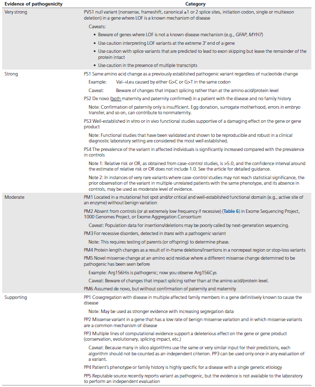 以下评估变异证据的方法是用分析释在临床诊断实验室中具有疑似遗传(主要指孟德尔遗传)疾病患者的变异。并不适用于解读体细胞变异、药物基因组(PGx)变异、或者是多基因非孟德尔复杂疾病相关的基因变异。在外显子组或基因组研究中,对候选基因(意义不明确的基因(GUS))应用这些准则时应当谨慎(见下面注意事项),因为本指南目的不是满足鉴定新致病基因的研究需求。