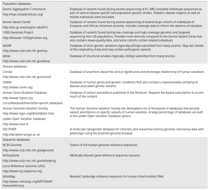 Population databases (Table 1) are useful in obtaining the frequencies of variants in large populations. Population databases cannot be assumed to include only healthy individuals and are known to contain pathogenic variants. These population databases do not contain extensive information regarding the functional effect of these variants or any possible associated phenotypes. When using population databases, one must determine whether healthy or disease cohorts were used and, if possible, whether more than one individual in a family was included, as well as the age range of the subjects.