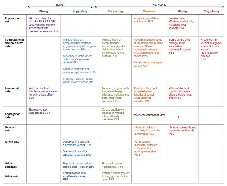 The American College of Medical Genetics and Genomics (ACMG) previously developed guidance for the interpretation of sequence variants.1 In the past decade, sequencing technology has evolved rapidly with the advent of high-throughput next-generation sequencing. By adopting and leveraging next-generation sequencing, clinical laboratories are now performing an ever-increasing catalogue of genetic testing spanning genotyping, single genes, gene panels, exomes, genomes, transcriptomes, and epigenetic assays for genetic disorders. By virtue of increased complexity, this shift in genetic testing has been accompanied by new challenges in sequence interpretation. In this context the ACMG convened a workgroup in 2013 comprising representatives from the ACMG, the Association for Molecular Pathology (AMP), and the College of American Pathologists to revisit and revise the standards and guidelines for the interpretation of sequence variants. The group consisted of clinical laboratory directors and clinicians. This report represents expert opinion of the workgroup with input from ACMG, AMP, and College of American Pathologists stakeholders. These recommendations primarily apply to the breadth of genetic tests used in clinical laboratories, including genotyping, single genes, panels, exomes, and genomes. This report recommends the use of specific standard terminology—“pathogenic,” “likely pathogenic,” “uncertain significance,” “likely benign,” and “benign”—to describe variants identified in genes that cause Mendelian disorders. Moreover, this recommendation describes a process for classifying variants into these five categories based on criteria using typical types of variant evidence (e.g., population data, computational data, functional data, segregation data). Because of the increased complexity of analysis and interpretation of clinical genetic testing described in this report, the ACMG strongly recommends that clinical molecular genetic testing should be performed in a Clinical Laboratory Improvement Amendments–approved laboratory, with results interpreted by a board-certified clinical molecular geneticist or molecular genetic pathologist or the equivalent.