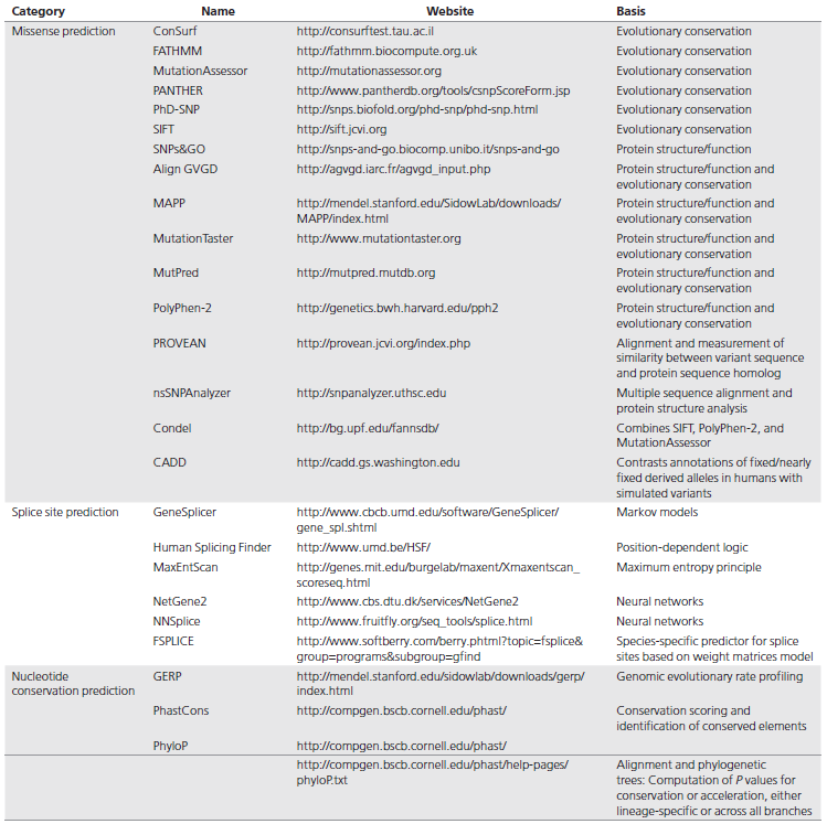 A variety of in silico tools, both publicly and commercially available, can aid in the interpretation of sequence variants. The algorithms used by each tool may differ but can include determination of the effect of the sequence variant at the nucleotide and amino acid level, including determination of the effect of the variant on the primary and alternative gene transcripts, other genomic elements, as well as the potential impact of the variant on the protein. The two main categories of such tools include those that predict whether a missense change is damaging to the resultant protein function or structure and those that predict whether there is an effect on splicing (Table 2). Newer tools are beginning to address additional noncoding sequences.